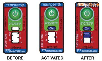 TempDot™Plus標(biāo)簽應(yīng)存儲(chǔ)在室溫下,并必須在反應(yīng)溫度閾值以上被激活。激活是通過(guò)用手指推壓。"On"字出現(xiàn)在第一個(gè)窗口中顯示激活。之后5分 鐘內(nèi),在反應(yīng)溫度或低于反應(yīng)溫度的情況下將標(biāo)簽貼到產(chǎn)品上。藍(lán)色染料熔化并以控制的速率遷移,,經(jīng)過(guò)白色大窗口。這表示暴露在溫度閾值以上的累計(jì)時(shí)間。當(dāng)溫 度低于閾值時(shí),該染料固化并停止移動(dòng)。如果溫度超過(guò)閾值,TempDot®Plus標(biāo)簽提供即時(shí)的視覺(jué)跡象。